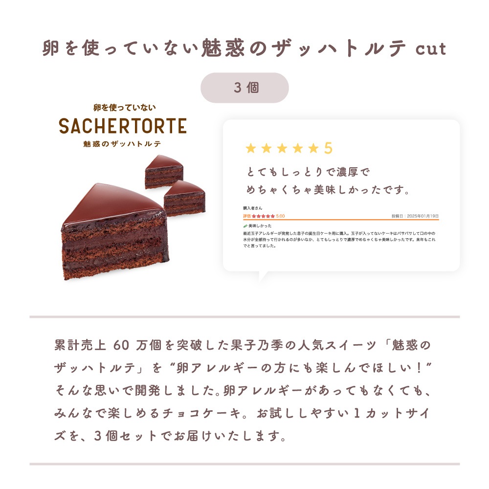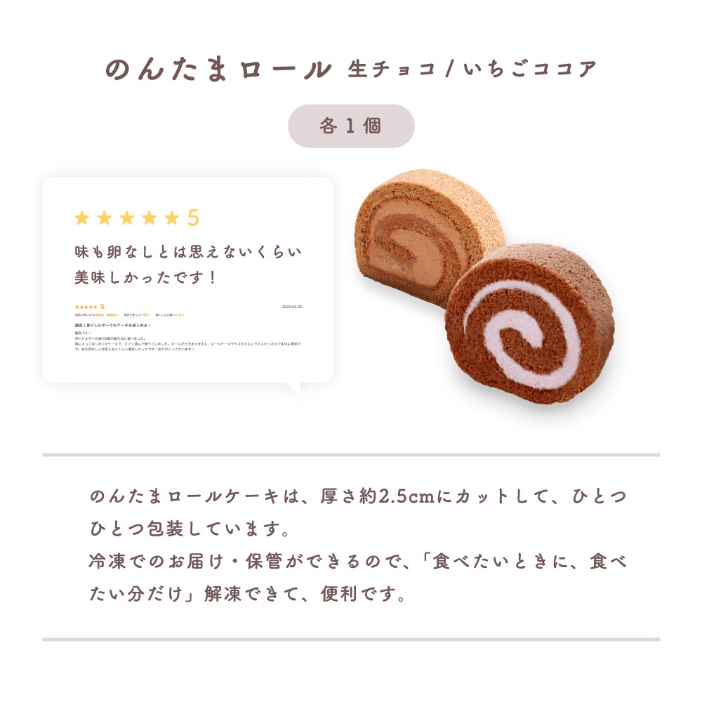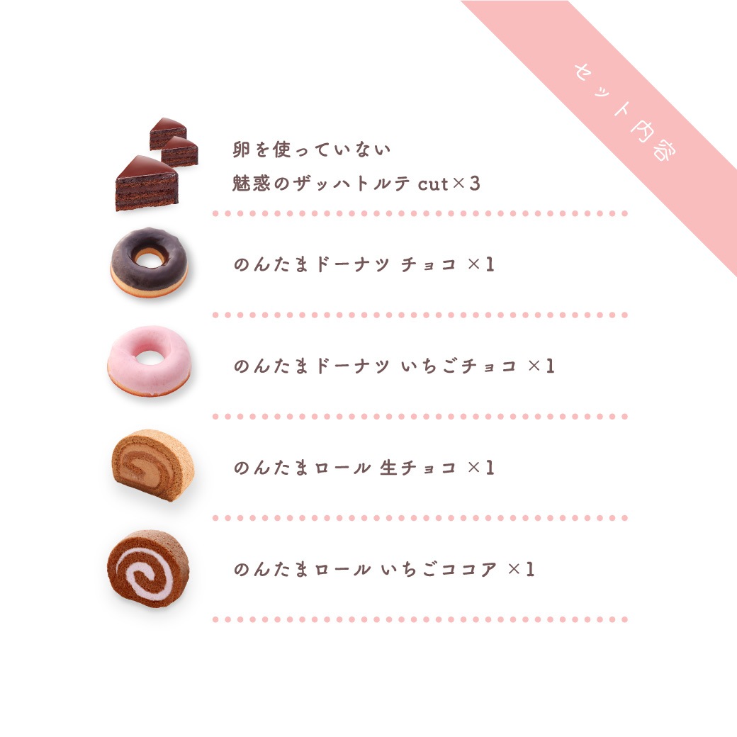 | 内容量 | 卵不使用ザッハトルテcut×3、のんたまドーナツ(チョコ・いちごチョコ)各1、のんたまロールケーキ(生チョコ・いちごココア)各1 | ||
